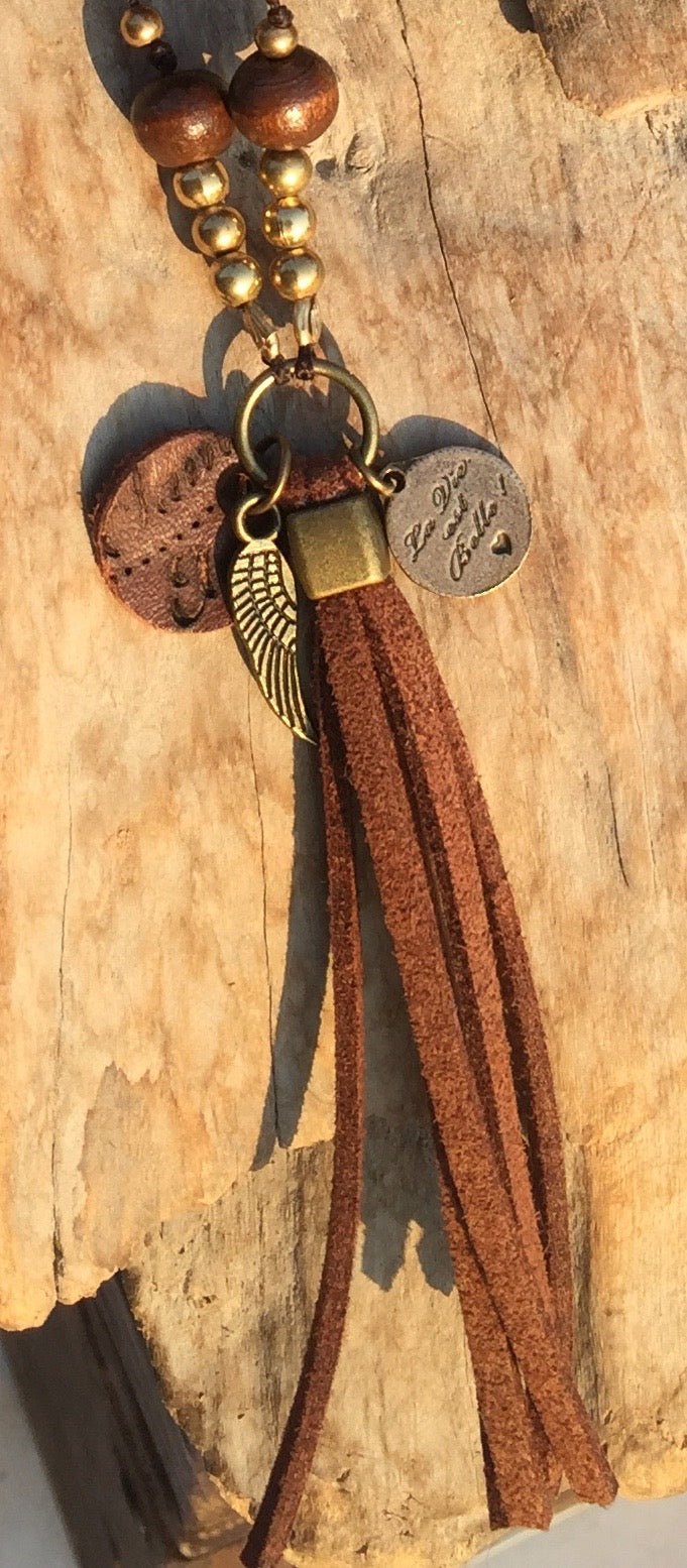 Sautoir réalisé avec des perles en bois de 6 mm, des perles en laiton sans nickel de 2mm. Inspiré des chapelets réalisés par les moines boudhistes, il est monté sur un fil poissé sur lequel les perles sont nouées. véritable exercice de méditation il nécessite environ 4 heures pour sa réalisation. Le pompon est réalisé avec un cuir végétal. Il est agrémenté d'une médaille : La vie est belle créée par l'Atelier. 52 cm